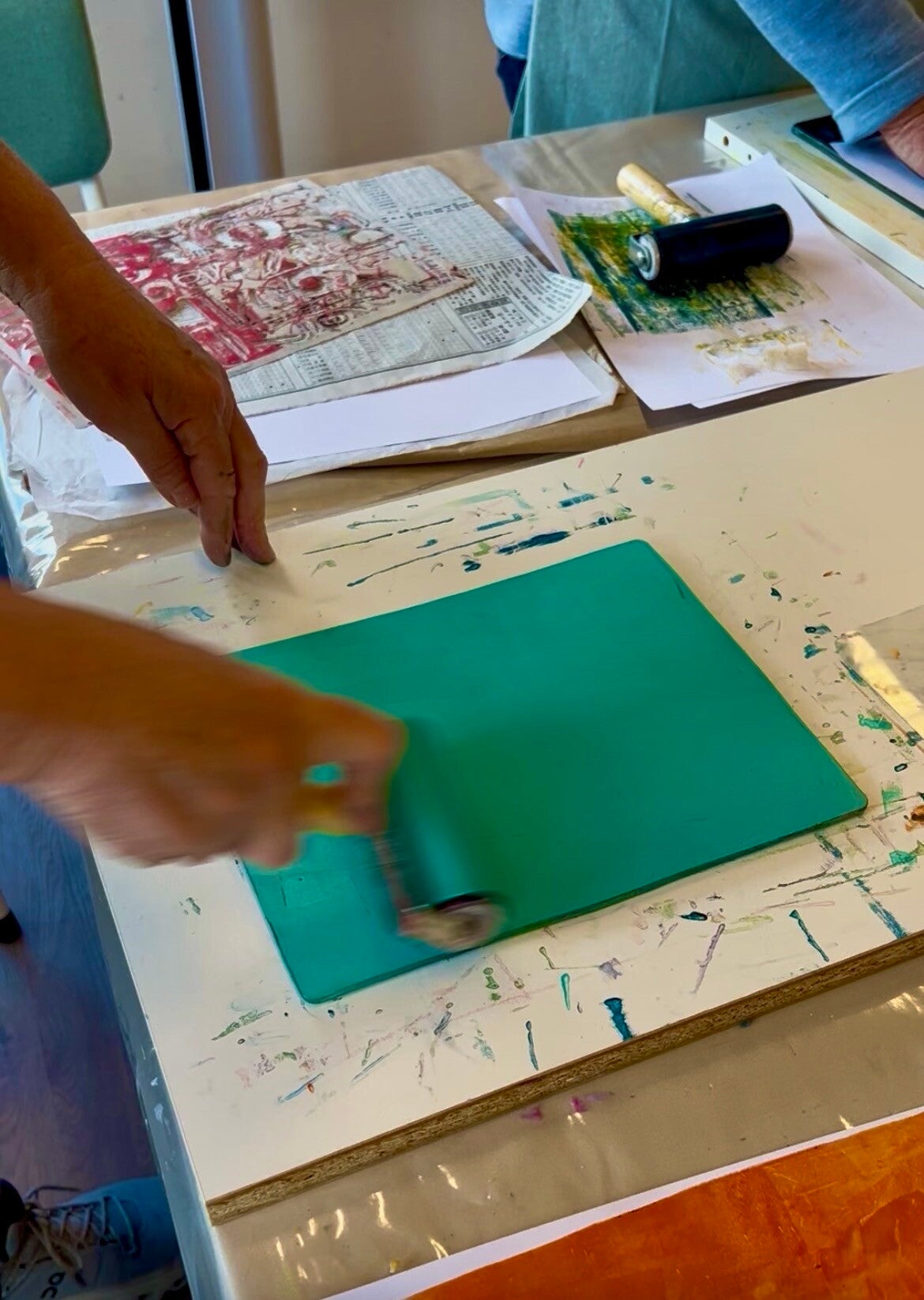 Ik kom naar jullie toe met alles wat nodig is. Deelnemers gaan individueel aan de slag met collage en gelli plate technieken en ontwerpen een eigen cover voor een notitieboek. Geen kunstopleiding nodig. Geen goed of fout. Alleen doen.