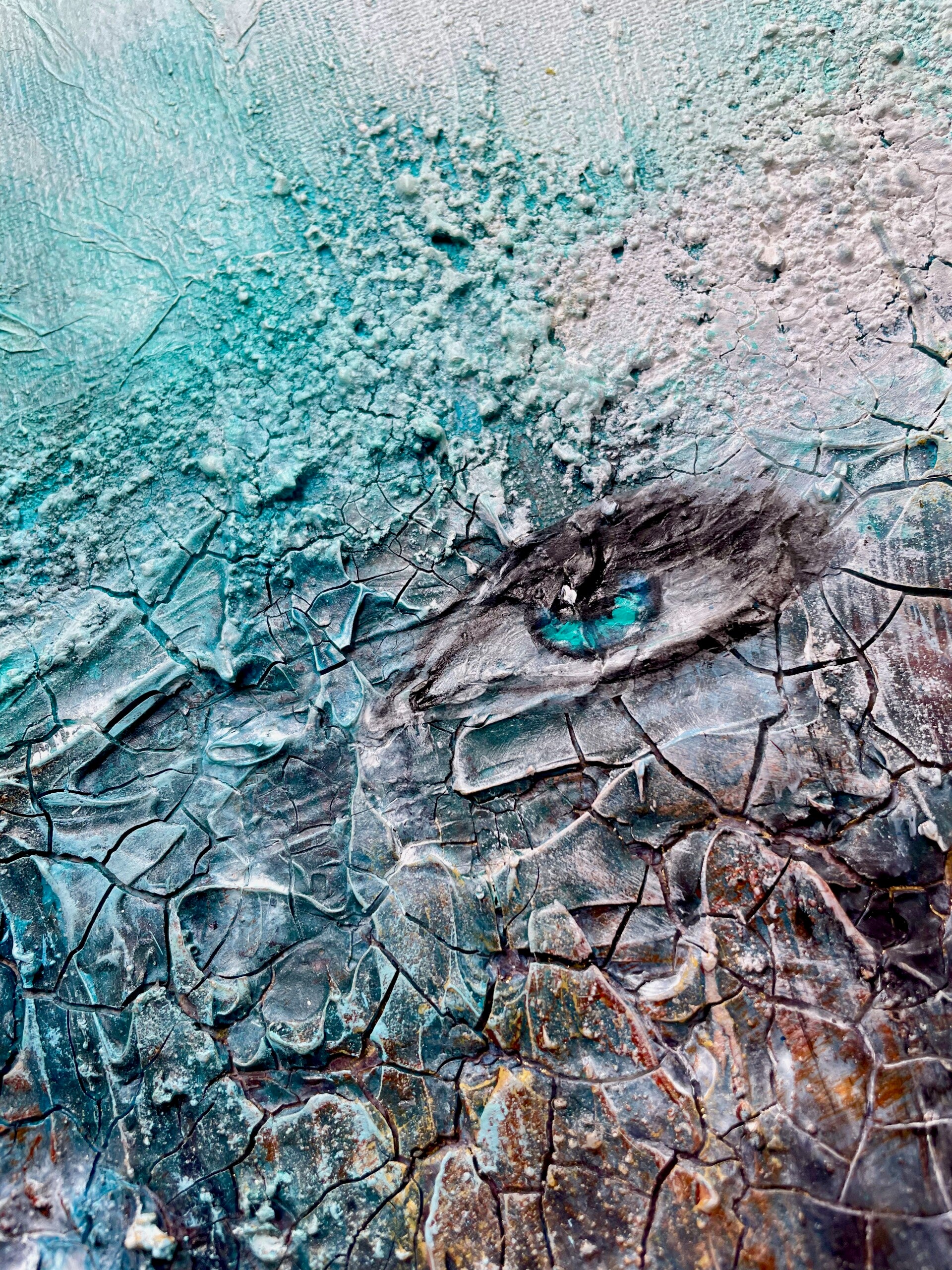 In de wazige mist van turquoise en ijzige blauwtinten duikt plots een oog op, helder, nieuwsgierig, bijna menselijk. Alsof het schilderij jou aankijkt en vraagt: Durf jij naar binnen te kijken?