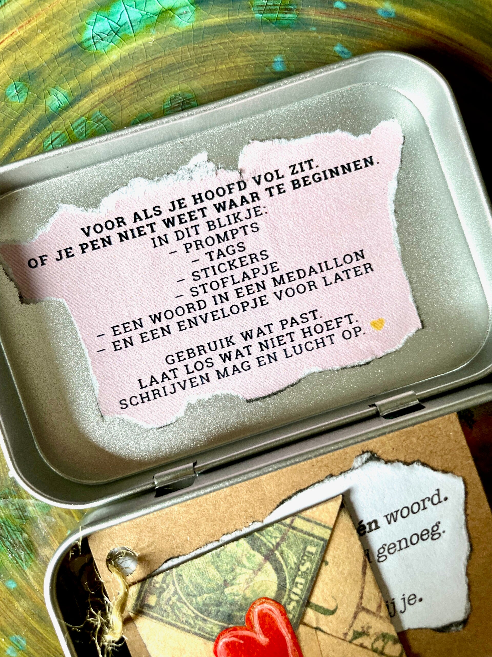 Deze mini-kit is een speelse, kleurrijke uitnodiging om te schrijven, voelen, plakken, krassen en gewoon te zijn. Alles mag. Er is geen goed of fout. Dit is jouw creatieve ruimte, verpakt in een handzaam blikje vol verrassingen.