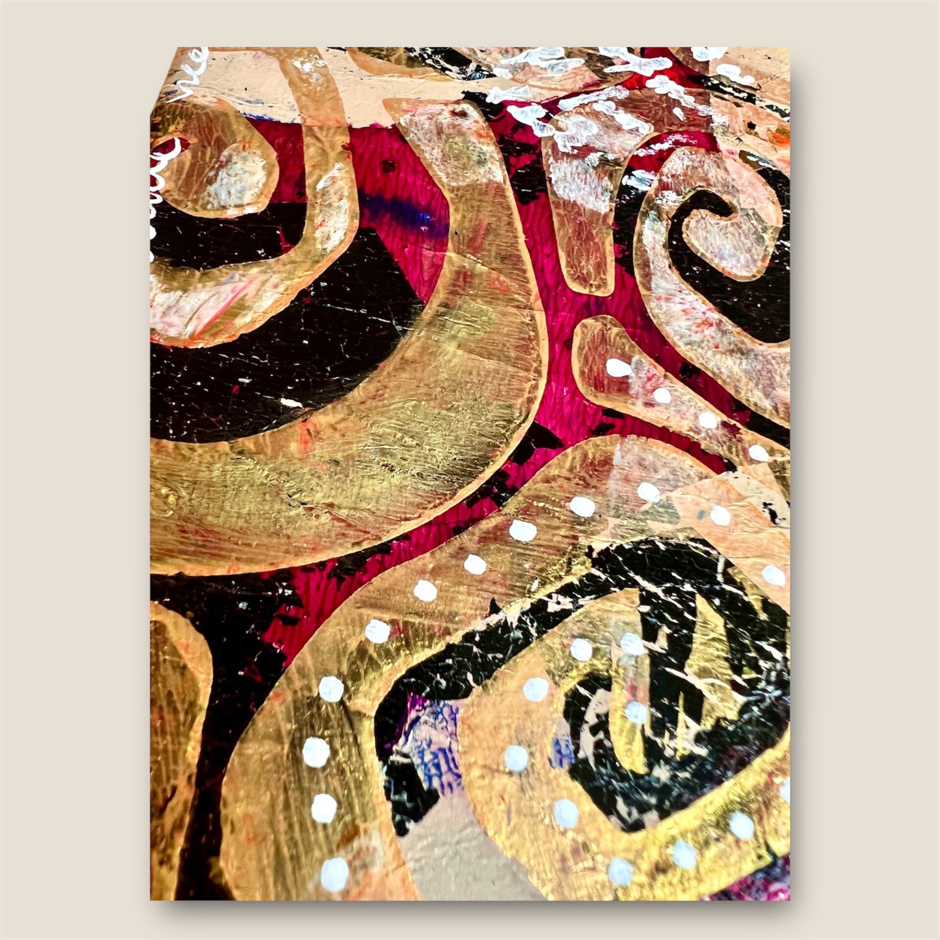 Elke cover is met zorg opgebouwd op de gelli plate, met collage-elementen, acrylverf en metallic goudaccenten. Spiraalvormen, stippen en structuren dansen over karmijnrood, diepzwart en oudroze. Elke journal is uniek en heeft zijn eigen energie.