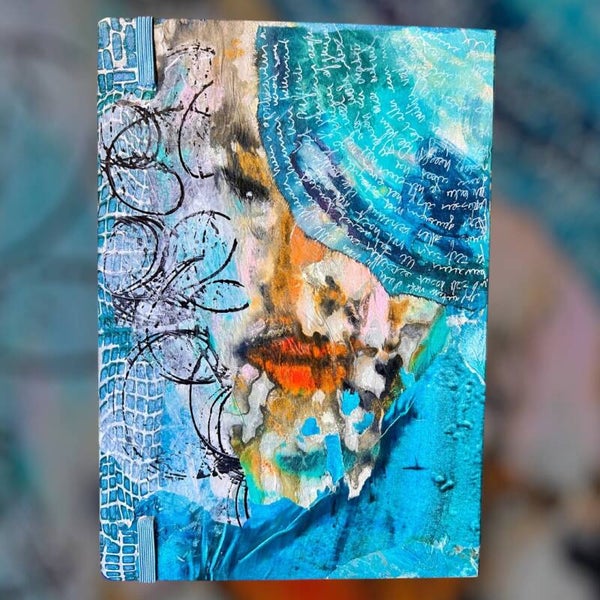 Echo is een journal met kleurrijk portret in blauw en collage-details