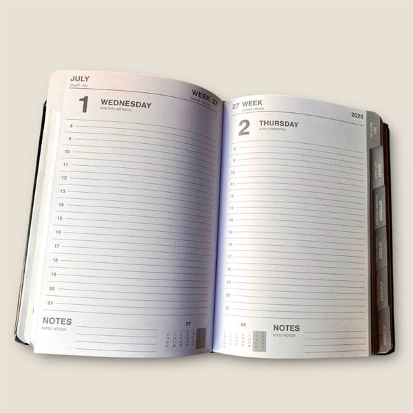 Binnenin vind je een overzichtelijke dagindeling, een pagina per dag, ruimte voor notities en een royaal formaat van ca. 21 × 15 cm. Een praktische en persoonlijke plek voor plannen, reflecties of gewoon een mooi begin van je dag.