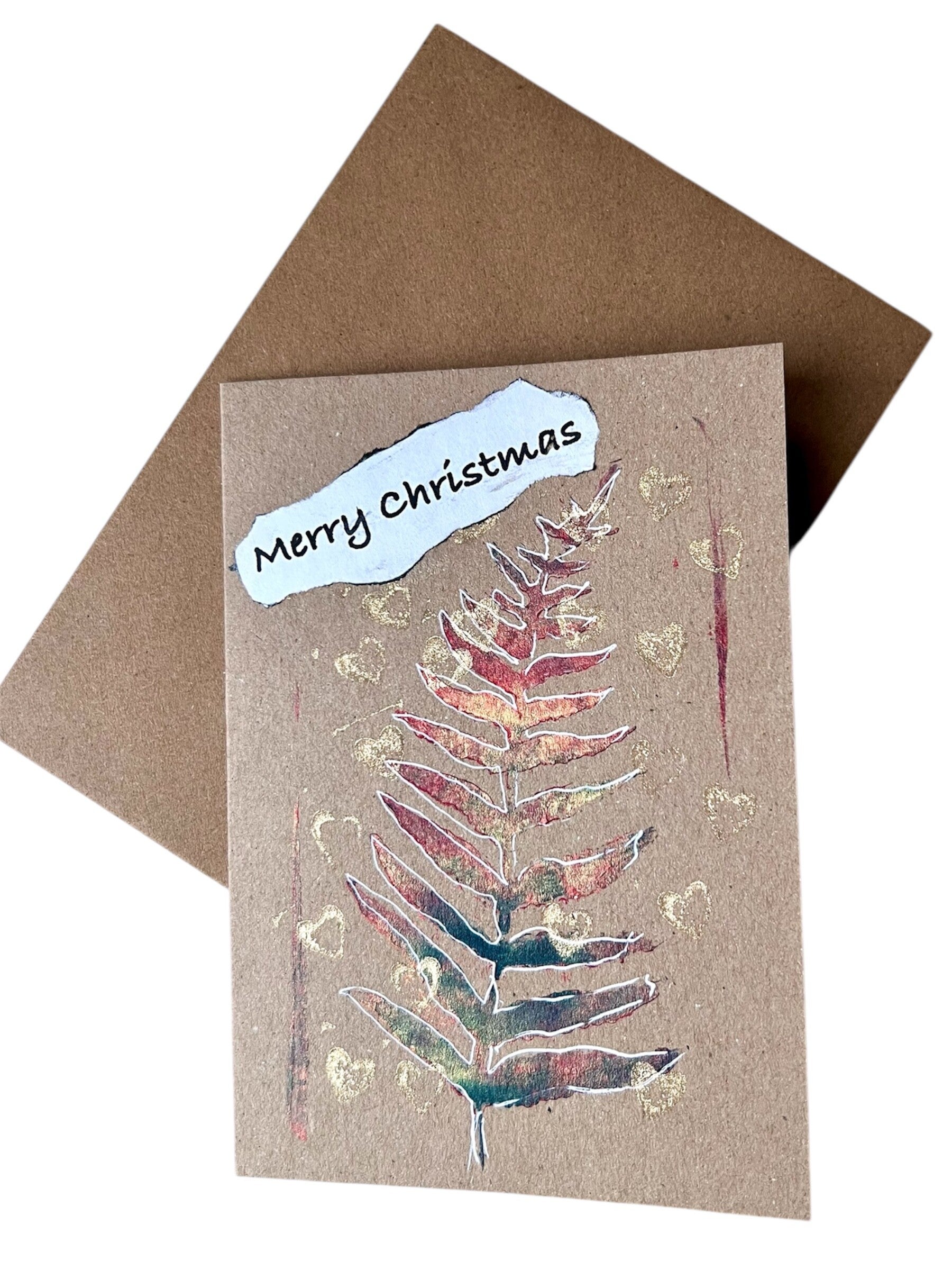 Een originele kerstkaart, gedrukt met de gel plate techniek en met de hand afgewerkt. Elke kaart is uniek en straalt warmte en aandacht uit.