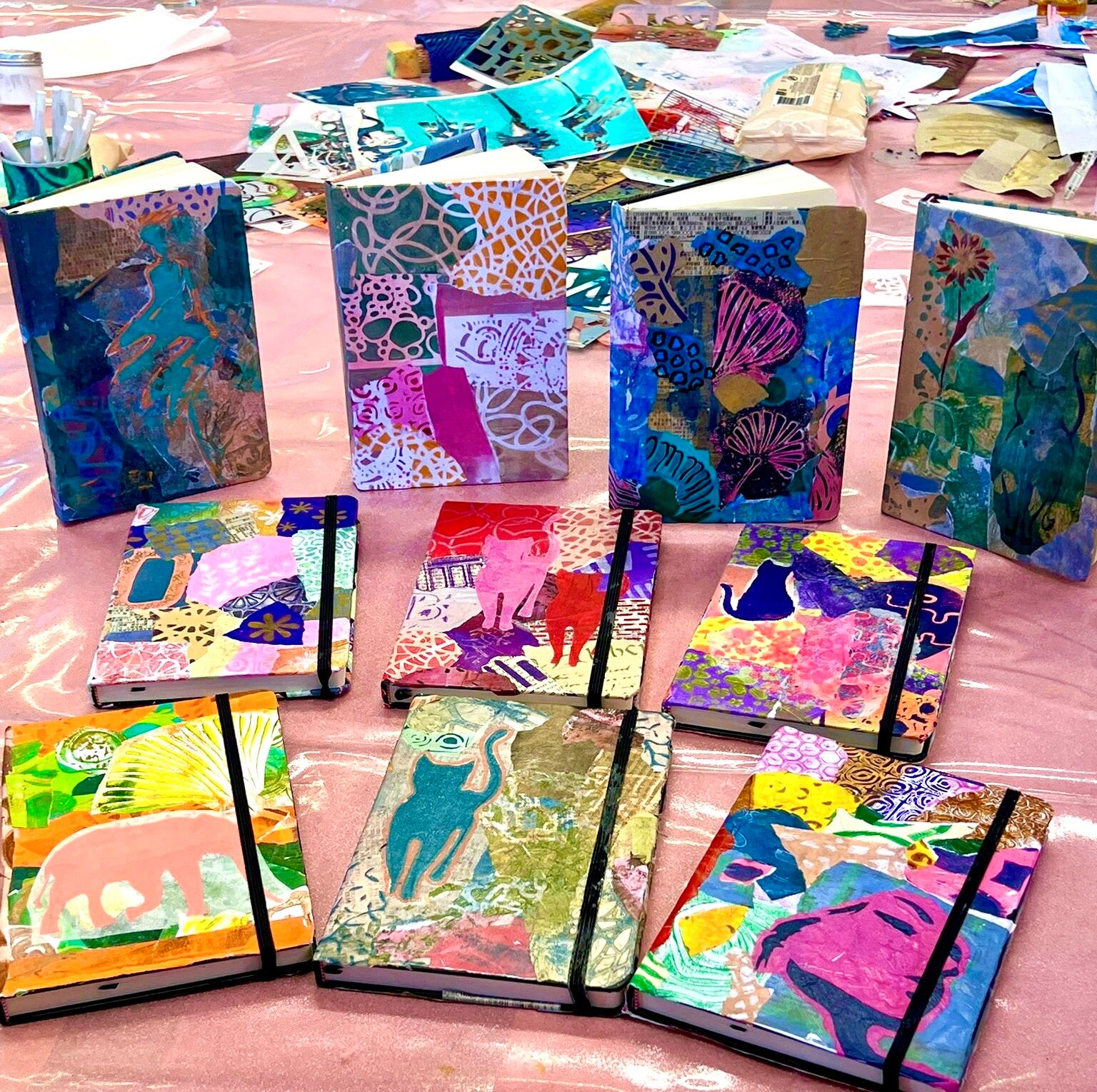 We gaan aan de slag met de Gelli Plate, acrylverf en verschillende soorten papier. Je maakt je eigen kleurrijke prints en gebruikt die om een zwart notitieboekje om te toveren tot een persoonlijk journal.